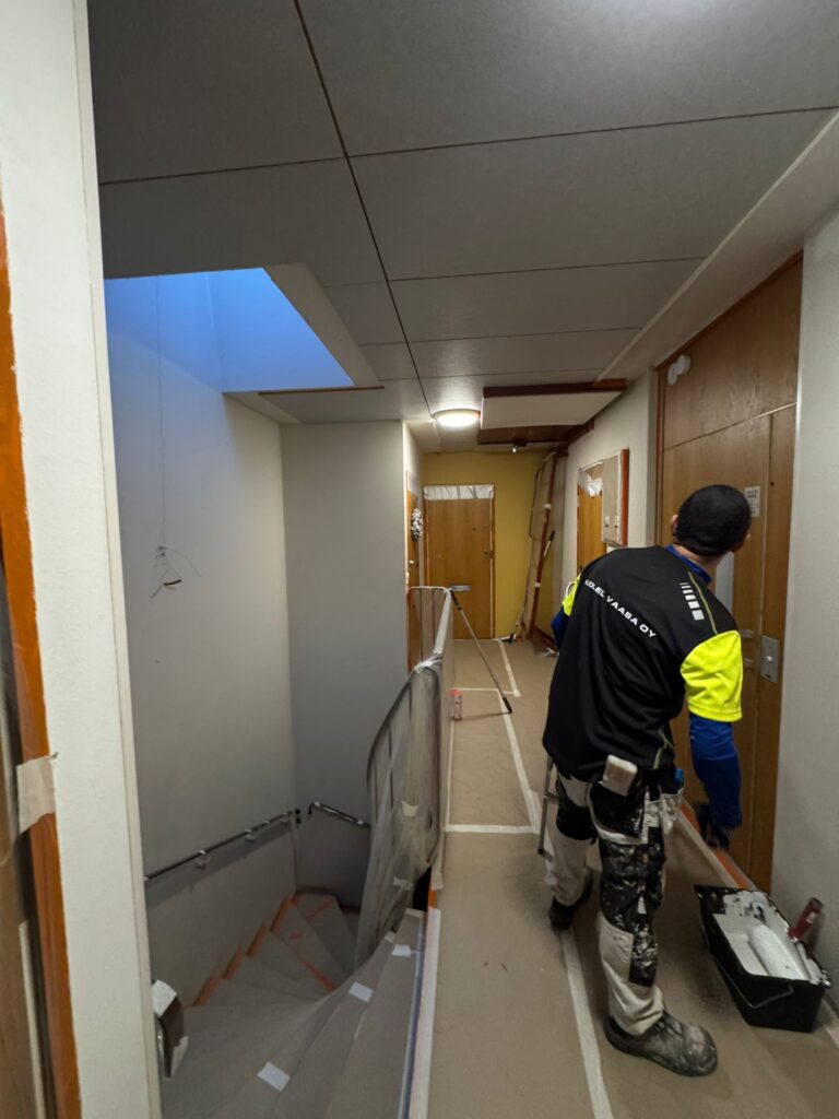 Urakkaan sisältyi rappukäytävän seinien sekä kattojen kokonaisvaltaiset tasoite- ja maalaustyöt.